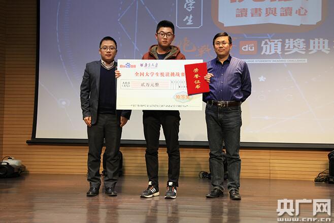央廣網(wǎng)北京1月23日消息 1月22日,百度與南京大學共同舉辦的“全國大學生悅讀挑戰(zhàn)賽”隨著頒獎儀式的舉行落下帷幕。百度校園品牌部主任李軒涯、百度校園品牌部副主任計湘婷、百度閱讀總經(jīng)理胡鑫及南京大學社科處副處長巢乃鵬、南京大學學工處副處長蔣恩銘出席了此次典禮并為大賽獲獎選手頒獎。央廣網(wǎng)作為本次活動的媒體合作伙伴,特邀請中央人民廣播電臺主持人馬宗武擔任本次活動主持。此外,頒獎典禮特別邀請到著名文化學者于丹教授,以“讀書與讀心”為主題分享了自己對閱讀的理解,獲得了觀眾熱烈反響。