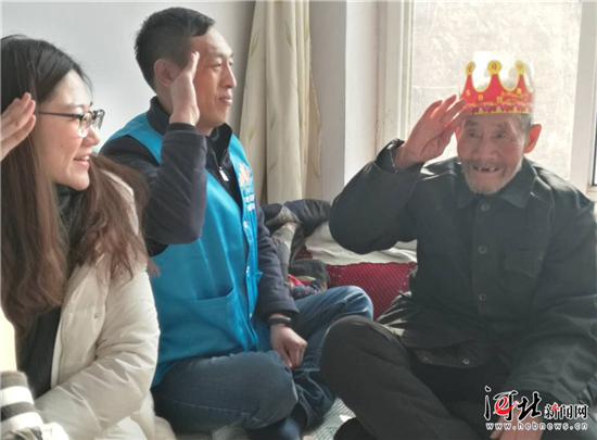 1月24日,秦皇島市志愿服務(wù)隊(duì)來到抗戰(zhàn)老兵徐山家中進(jìn)行慰問,并為老人慶祝生日。圖為徐山老人高興的向大家敬起了軍禮。記者宋柏松攝
