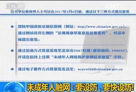 這個條例的征求意見截止日期到1月6日,在這之前,可以過三種方式提出意見——一個是通過登錄中國政府法制信息網(wǎng)的方式提出意見,另外一個過寄信的方式寄到一個北京市2067信箱,還有一個過電子郵件的方式把意見發(fā)到郵箱wcnrwlbh@chinalaw.gov.cn里面。這樣的條例準(zhǔn)備出臺要面對的是一個什么樣的問題呢?這個問題是非常現(xiàn)實的,因為現(xiàn)在對于未成年人來說觸網(wǎng)的年齡更加提前了,觸網(wǎng)的范圍更加擴大,觸網(wǎng)的程度更加復(fù)雜……面對這么一個迫在眉睫的問題,面對普遍家長們非常關(guān)心孩子們成長的問題,條例會怎樣解決呢?