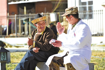 圖為駐藏某部醫(yī)生為孤寡老人義診。