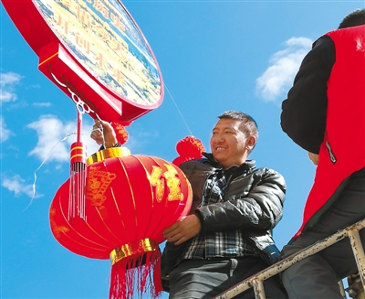 圖為節(jié)日前夕,林芝市市政局工作人員在掛燈籠。