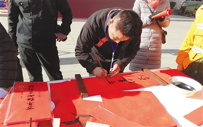 圖為林芝市書(shū)法家協(xié)會(huì)會(huì)員在現(xiàn)場(chǎng)為群眾寫(xiě)春聯(lián)。