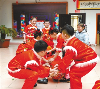圖為參加林芝市2017年迎新春聯(lián)歡會(huì)表演的小朋友們?cè)诠?jié)目開(kāi)始前玩游戲。