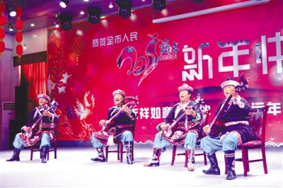 圖為在迎新春聯(lián)歡會(huì)上演員彈唱《工布扎年波動(dòng)》。