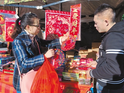 圖為今年選擇在林芝過(guò)新春佳節(jié)的唐女士在年貨市場(chǎng)挑選窗花。