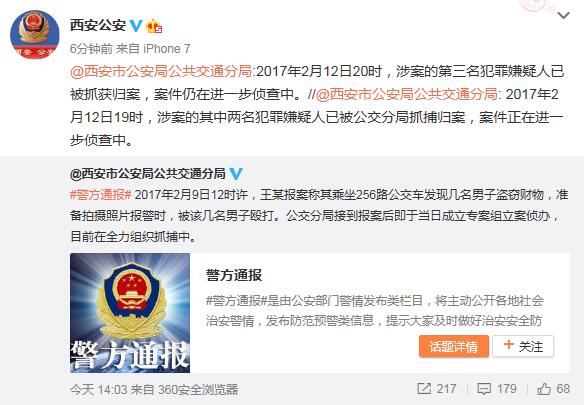 2月9日早上8時(shí)許,陜西一公車上少年大聲指認(rèn)車上小偷組織,卻反遭對(duì)方一行人拉下車狂毆。西安市公安局公共交通分局今日表示,2月9日12時(shí)許接到報(bào)案,當(dāng)日成立專案組。2月12日20時(shí),涉案的第三名犯罪嫌疑人已被抓獲歸案。此前,西安市公安局通報(bào)稱,已有兩名嫌疑人落網(wǎng)。