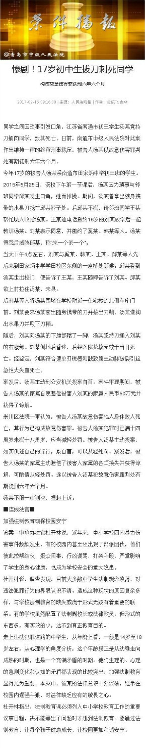 央廣網(wǎng)北京2月16日消息 據(jù)青島中級(jí)人民法院官微消息 同學(xué)之間因瑣事引發(fā)口角,江蘇省南通市初三學(xué)生湯某竟持刀捅向同學(xué),致其死亡。日前,南通市中級(jí)人民法院對(duì)此案作出維持一審的終審刑事裁定,被告人湯某以故意傷害罪判處有期徒刑六年六個(gè)月。