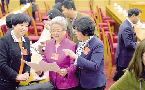 3月6日上午,人大江蘇代表團(tuán)在駐地舉行全體會(huì)議,審議政府工作報(bào)告。審議結(jié)束后,林志梅、孫秀芳、張紅三位代表(從左至右)就報(bào)告中相關(guān)章節(jié)繼續(xù)討論。本報(bào)記者 李景錄攝