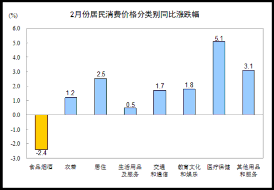 同比來看,2月份CPI上漲0.8%。其中,城市上漲0.9%,農(nóng)村上漲0.6%;食品價格下降4.3%,非食品價格上漲2.2%;消費(fèi)品價格下降0.1%,服務(wù)價格上漲2.4%。1-2月平均,全國居民消費(fèi)價格總水平比去年同期上漲1.7%。