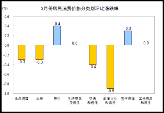 2月份,全國居民消費(fèi)價格總水平環(huán)比下降0.2%。其中,城市下降0.2%,農(nóng)村下降0.1%;食品價格下降0.6%,非食品價格下降0.1%;消費(fèi)品價格下降0.1%,服務(wù)價格下降0.3%。