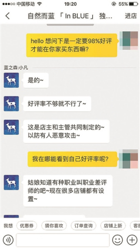 一家名為“自然而藍(lán)”的店鋪主營(yíng)服裝類商品,北青報(bào)記者以顧客身份進(jìn)行詢問(wèn),客服稱,買家發(fā)出的好評(píng)率要在98%以上,才可以在店中購(gòu)買。“好評(píng)率不夠就不行了,這也是店主和主管共同制定的,以防有人惡意攻擊。”客服人員稱,目前有很多家店鋪都有類似設(shè)置,“因?yàn)橛蟹N行當(dāng)叫職業(yè)差評(píng)師,所以很多家店鋪都會(huì)設(shè)置,只是標(biāo)準(zhǔn)不一樣,算是不成文的規(guī)矩!