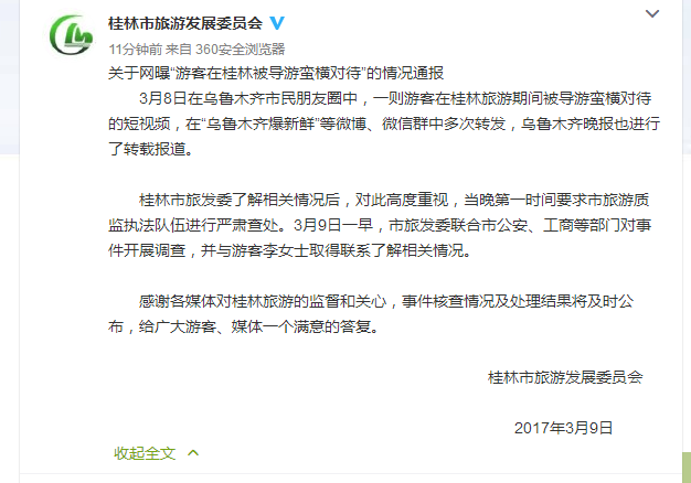 3月9日下午,桂林市旅游發(fā)展委員會官方回應稱,已要求市旅游質(zhì)監(jiān)執(zhí)法隊伍、市公安、工商等部門開展調(diào)查,核查情況及處理結(jié)果將及時公布。