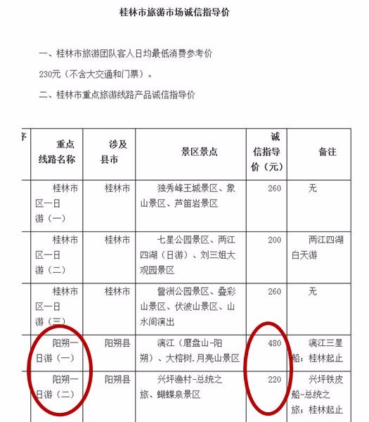 “此刻”注意到,2016年12月27日,桂林市旅行社協(xié)會發(fā)布了《桂林市旅行社投訴處理辦法》(試行)。同時,桂林市旅游發(fā)展委員會在其官方主頁上公布了16條旅游線路的誠信指導價。涉及陽朔的8條線路中有兩條為一日游,指導價分別為480元和220元,是李女士參繳納團費的5倍還多。