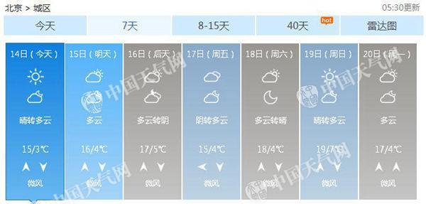 上周末,北京氣溫可謂是“跌宕起伏”,在11日飆至近20℃后,在冷空氣影響下又急轉(zhuǎn)直下,12日最高氣溫降至13.5℃,降幅超過6℃。昨天開始,冷空氣影響減弱,最高氣溫升至15℃左右。今天,北京最高氣溫仍將維持在15℃左右,最低氣溫2℃。