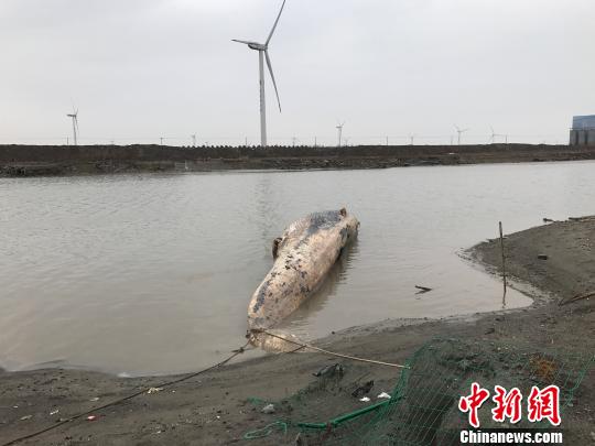22日一早,中新網(wǎng)記者抵達(dá)位處浦東大治河附近的現(xiàn)場(chǎng)時(shí),殞命鯨魚(yú)已在岸上,據(jù)稱,凌晨4時(shí)左右,此間漁政部門(mén)借助漲潮,將鯨魚(yú)拖上岸。