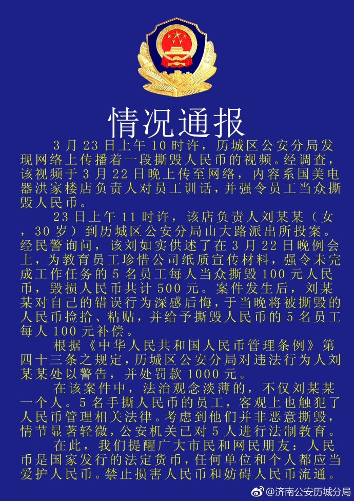 中新網(wǎng)3月23日電 據(jù)濟南市公安局歷城區(qū)分局官方微博消息,今日,歷城區(qū)公安分局就網(wǎng)上傳播的一段撕毀人民幣的視頻進行調查。調查結果顯示,視頻內容系國美電器洪家樓店負責人對員工進行訓話,并強令員工當眾撕毀人民幣。歷城區(qū)公安分局對違法行為人劉某某處以警告,并處罰款1000元。