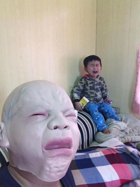 [觀察者網(wǎng)綜合]臺灣苗栗一名父親因?yàn)?歲兒子總是哭不停,為了讓兒子“將心比心”,體會看別人哭的感覺,異想天開買了個(gè)“嬰兒哭泣面具”,結(jié)果……孩子快嚇傻了…