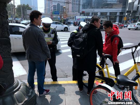 上午11時(shí)30分,在南京西路華山路路口,又有三人因在機(jī)動(dòng)車道騎行共享單車而被兩名交警攔下。三人均表示,“沒看到南京西路上非機(jī)動(dòng)車的禁行標(biāo)志,路邊找到共享單車就直接騎了,以后一定注意!”