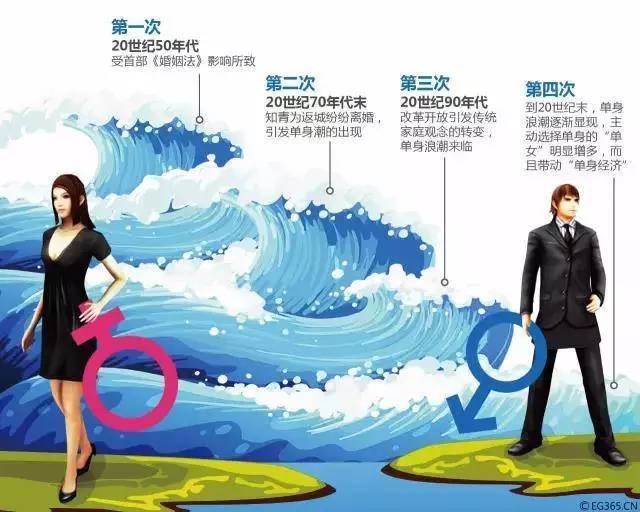 中國內(nèi)地曾經(jīng)出現(xiàn)過幾次單身潮。第一次是在20世紀50年代,首部《婚姻法》帶來了全國的離婚潮;20世紀70年代末,知青為了返城紛紛離婚,引發(fā)了第二次單身潮的出現(xiàn);20世紀90年代以來,改革開放引發(fā)傳統(tǒng)家庭觀念的轉變,第三次單身浪潮來臨; 到現(xiàn)在,隨著經(jīng)濟的飛速發(fā)展和女性自主意識的提升,第四次單身浪潮逐漸顯現(xiàn)。