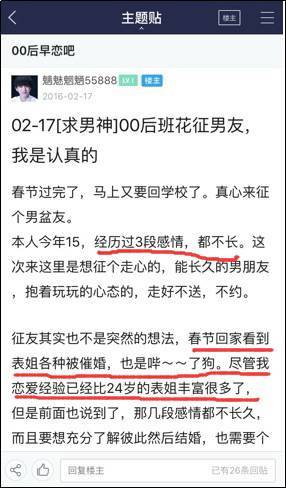 百度貼吧里的“00后早戀吧”里已經(jīng)有了兩千多萬的帖子,去年還有一位00后曾貼出“征婚帖”:
