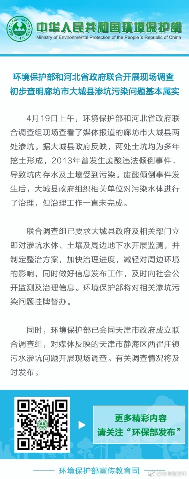 央廣網(wǎng)北京4月19日消息 據(jù)環(huán)境保護(hù)部宣傳教育司官方微博消息,環(huán)境保護(hù)部和河北省政府聯(lián)合開(kāi)展現(xiàn)場(chǎng)調(diào)查,初步查明廊坊市大城縣滲坑污染問(wèn)題基本屬實(shí)。