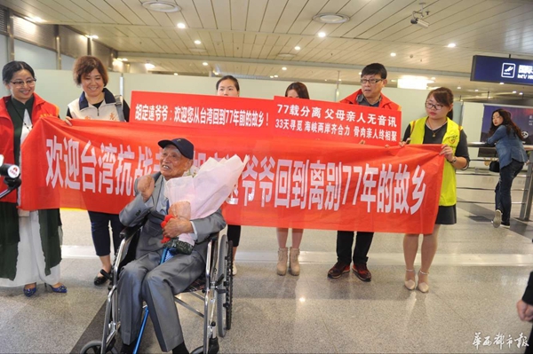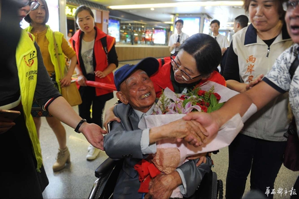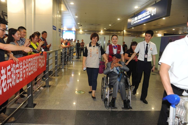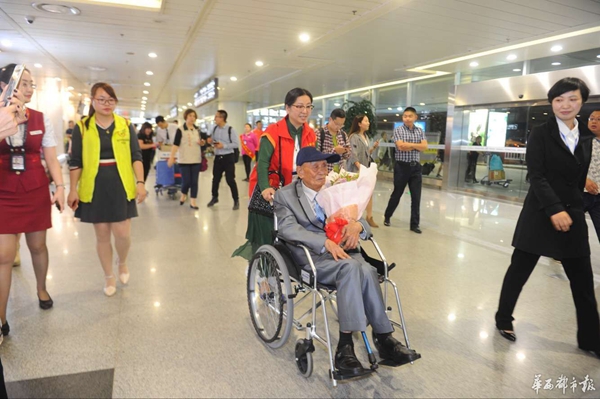 當(dāng)晚9點(diǎn)45分左右,胡定遠(yuǎn)坐在機(jī)場(chǎng)提供的輪椅上,出現(xiàn)在了眾人的視野里。面對(duì)前來迎接的志愿者,胡老微笑著,點(diǎn)頭、揮手以示回應(yīng),還用地道的瀘州話不斷說著“謝謝”。同時(shí),他的目光始終在打量周圍的景象,70余年時(shí)光飛逝,這里的景象早非當(dāng)年!肮烙(jì)老家沒人認(rèn)識(shí)我了!焙陷p嘆。