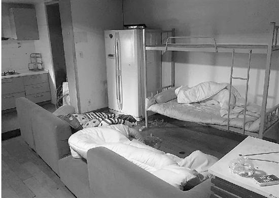 客廳內(nèi)有多張拆下來(lái)的床板;客廳放置了布藝的沙發(fā),沙發(fā)上還有兩床被子,看跡象是住過(guò)人的;旁邊是一張高低鋪床,臺(tái)子上還有塑料袋包裹著發(fā)出惡臭的茶葉蛋殼。