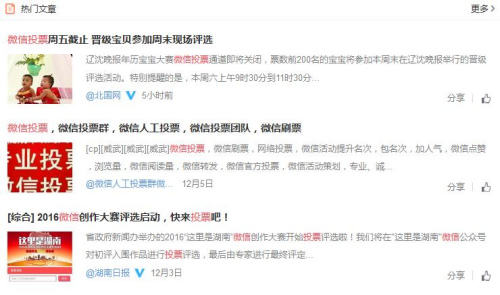 求贊拉票本來是在拼人氣,但也成為一些人的煩惱。為了在“票”數(shù)上一決雌雄,求贊票者不遺余力,撒錢拉人獎(jiǎng)品引誘,各顯其能。對(duì)于接受“點(diǎn)贊”任務(wù)的朋友們,礙于情面,不論事實(shí)怎樣,動(dòng)動(dòng)拇指做個(gè)順?biāo)饲,但時(shí)間久了,也是惹人煩、不勝其擾?梢哉f,求贊拉票已經(jīng)為朋友圈一大累贅,一大負(fù)擔(dān)。更令人匪夷所思的是,“刷票”,不僅在比實(shí)力,拼人脈,還可以搞“產(chǎn)業(yè)”。在網(wǎng)上搜索“微信投票”,很快就能出現(xiàn)“微信人工刷票”“微信投票群”“微信投票團(tuán)隊(duì)”等收費(fèi)刷票的信息,可見其背后潛藏著的利益鏈條。