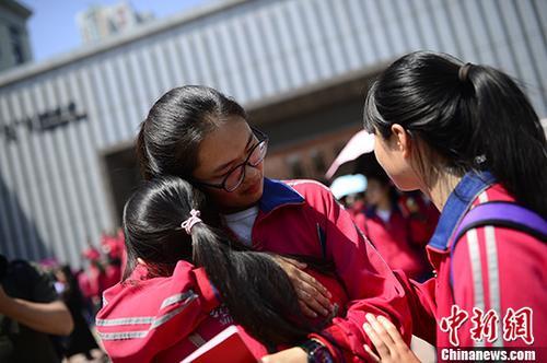 資料圖:內蒙古高中生畢業(yè)典禮 同學擁抱惜別。中新社記者 劉文華 攝
