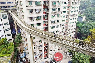 微博上曾有一組照片顯示渝中區(qū)一處天橋,橋的一端從地面連接到另一棟樓的13層。該微博發(fā)出后,引發(fā)了網友對該天橋所在地的各種猜想。