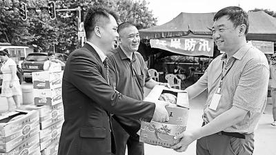 昨天,全國勞模、省市道德模范甘金華(中)攜武漢藍天龍韻大飯店總經(jīng)理陳匯(左)、闖王餐飲管理有限公司等眾多愛心企業(yè),來到四唯碼頭附近江堤,為駐守在那里的二七街防汛應(yīng)急指揮部送去礦泉水、西瓜、方便面等價值數(shù)萬元的物資。
