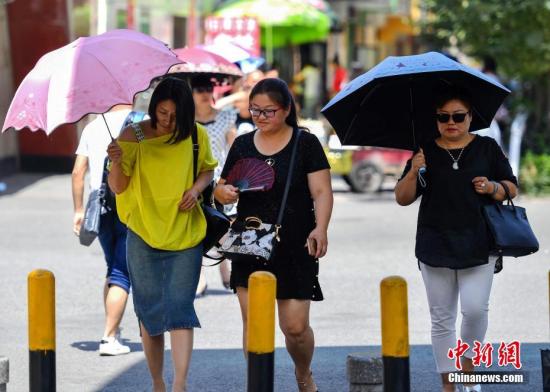 7月6日,新疆烏魯木齊市最高溫度達(dá)到36攝氏度,外出民眾打著傘、搖著扇子也難以抵御炎熱的天氣。 中新社記者 劉新 攝