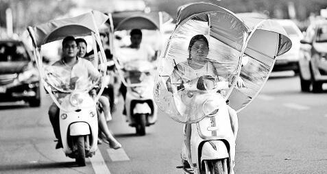 高溫下,不少電動(dòng)車裝上遮陽(yáng)篷,躲避太陽(yáng)的暴曬
