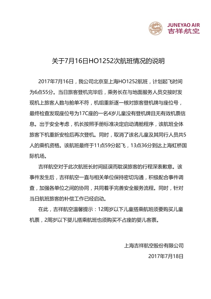 吉祥航空表示,HO1252航班的計(jì)劃起飛時(shí)間為6點(diǎn)55分,機(jī)組在核對(duì)人數(shù)時(shí)發(fā)現(xiàn),17C座的4歲兒童沒(méi)有登機(jī)牌且無(wú)有效的機(jī)票信息。出于安全考慮,機(jī)長(zhǎng)按照手冊(cè)標(biāo)準(zhǔn)決定啟動(dòng)清艙程序,該航班旅客在下飛機(jī)安檢之后重新登機(jī),同時(shí)取消了該兒童及同行5人的乘機(jī)資格。該航班最終于11點(diǎn)59分起飛,并與13點(diǎn)36分到達(dá)上海虹橋國(guó)際機(jī)場(chǎng)。