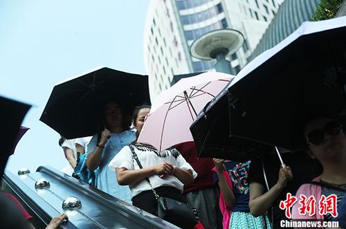7月21日,上海街頭的行人以各種辦法遮擋炙熱的陽光。當(dāng)日12時22分,上海中心氣象臺發(fā)布今夏首個高溫紅色預(yù)警,中心城區(qū)最高氣溫將達(dá)40℃。 中新社記者 湯彥俊 攝