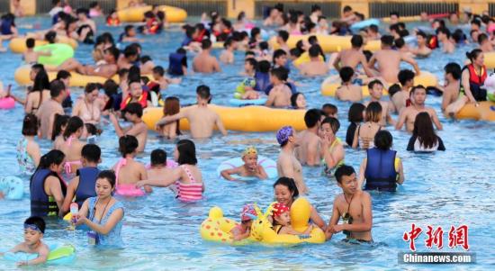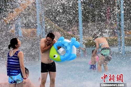 7月19日,游客在武漢市一水上公園戲水納涼。近日,湖北省武漢市持續(xù)高溫天氣,不少市民外出戲水納涼,體驗(yàn)水上樂園推出的趣味活動。中新社記者 張暢 攝