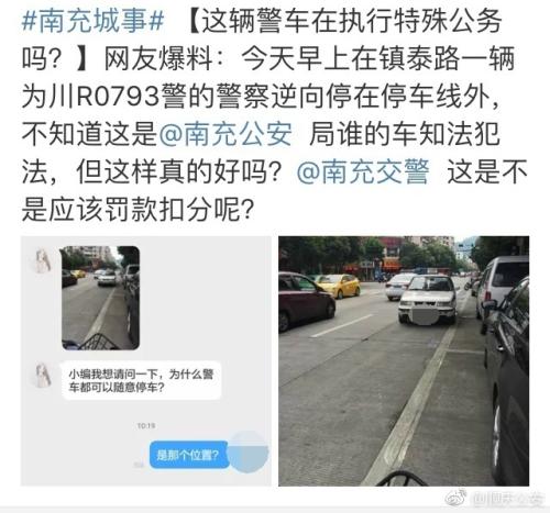 中新網(wǎng)8月13日電 據(jù)四川南充市公安局順慶區(qū)分局官方微博消息,2017年8月12日上午10時(shí)許,新浪微博用戶發(fā)帖稱“今天早上在鎮(zhèn)泰路一輛為川R****的警車逆向停在停車線外",質(zhì)疑警車“亂停放",順慶區(qū)分局發(fā)現(xiàn)該情況后立即組織人員開(kāi)展調(diào)查工作。