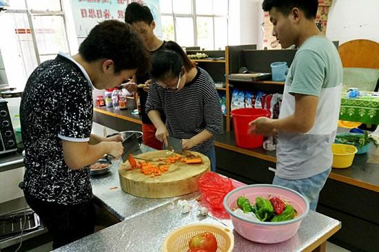 同學(xué)們?cè)诠蚕韽N房做飯。圖片來(lái)源:中國(guó)青年報(bào)(湖北大學(xué)楊海北供圖)