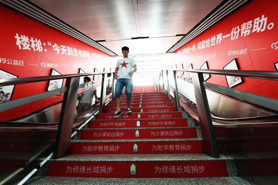近日,杭州一地鐵站多了一道特別的“愛心臺(tái)階”。該樓梯上下兩端分別設(shè)置了紅外感應(yīng)器,當(dāng)乘客走完這59級(jí)臺(tái)階時(shí),旁邊的大屏幕會(huì)記下步數(shù),并將這步數(shù)轉(zhuǎn)化為公益事業(yè)的捐款,因此吸引了不少杭州市民和游客前來(lái)走過“愛心臺(tái)階”。視覺中國(guó)供圖