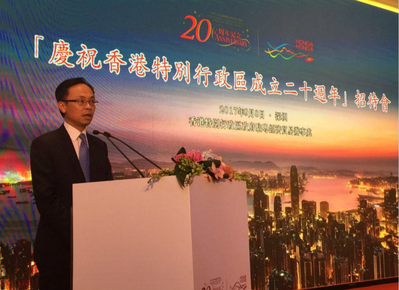 央廣網(wǎng)深圳9月9日消息(記者黃倩)昨晚(8日),由香港特區(qū)政府駐粵經(jīng)濟貿(mào)易辦事處主辦的“慶祝香港特別行政區(qū)成立二十周年”招待會在深圳舉行。香港特區(qū)政府政制及內(nèi)地事務(wù)局局長聶德權(quán)出席并致辭表示,深港合作將踏上新臺階。