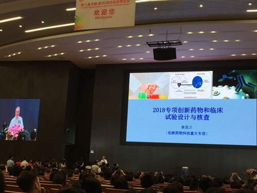 出席開幕式的有全國人大常委會原副委員長桑國衛(wèi),江蘇省人民政府省長吳政隆,中國國際貿(mào)易促進委員會會長姜增偉,國家食品藥品監(jiān)管總局副局長焦紅,中國農(nóng)工黨中央副主席曲鳳宏,江蘇省人民政府副省長藍紹敏,泰州市委書記曲福田,泰州市市長史立軍,中國工程院院士沈倍奮、劉秀梵、夏咸柱、金寧一,軍事醫(yī)學科學院生物工程研究所所長陳薇、研究員張永祥,德國科學院院士來茂德,英國皇家醫(yī)學院院士朱寧文,西班牙皇家科學院院士阿德里安,國際遺傳工程與生物技術中心總干事馬烏洛·吉阿卡,巴西維亞納市市長吉爾森·丹尼爾·巴蒂斯塔等。藍紹敏、焦紅、姜增偉、曲福田等分別致辭,桑國衛(wèi)先生作了題為《2018專項創(chuàng)新藥物和臨床試驗設計與核查》的主題報告。