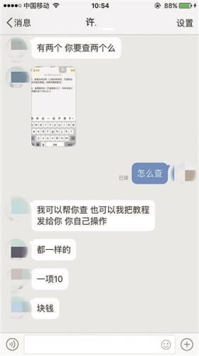 北青報記者聯(lián)系到一位自稱可以查訪客的許郡(化名),許郡介紹了兩種查詢方式,分別是“查最近來訪”和“查頻繁來訪”,并稱前者人數(shù)會有很多,后者只能查前七個,每項收費10元,查詢后也可以把“教程”發(fā)來。
