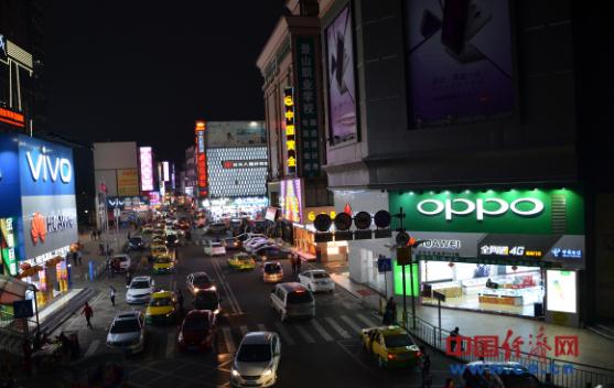 資料圖片:2017年2月27日,廣東省東莞市塘廈鎮(zhèn)手機(jī)店鋪夜景。