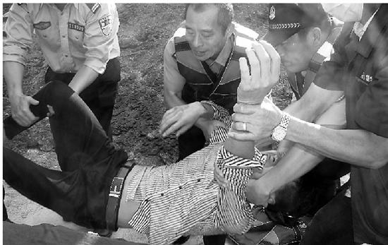 跳江男子被抬上岸。