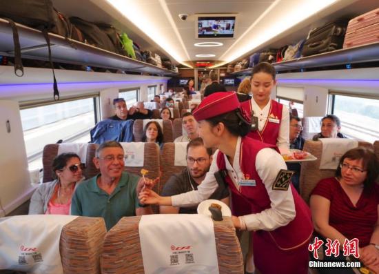資料圖:10月4日,正值中國傳統(tǒng)節(jié)日中秋節(jié),在北京南開往上海虹橋的G13次“復(fù)興號”高鐵列車上,乘務(wù)組給旅客發(fā)月餅、猜燈謎,共度中秋。中新社記者 賈天勇 攝
