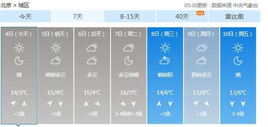 近期氣溫起起伏伏,晝夜溫差大,早晚氣溫偏低,提醒市民朋友,出門前需關(guān)注臨近預(yù)報(bào),適時(shí)增添衣物,以免感冒。北京市氣象臺6時(shí)發(fā)布最新預(yù)報(bào),今天白天晴間多云,北轉(zhuǎn)南風(fēng)二三間四級,最高氣溫14℃;夜間晴間多云,南部地區(qū)有輕霧,南轉(zhuǎn)北風(fēng)一二級,最低氣溫3℃。