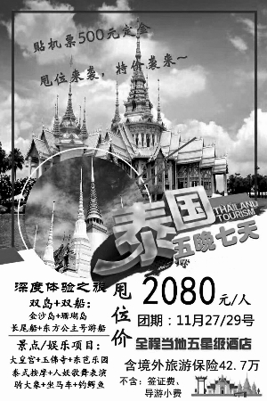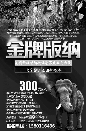 記者來到位于青年路一處老舊小區(qū)的北京金色陽光旅行社,咨詢?yōu)楦改笀竺眯袌F(tuán),工作人員立即拿出手機(jī),將其中幾條線路海報電子版給記者看,其中一張是去泰國的,“現(xiàn)在去泰國天氣暖和,老人們都喜歡。年底我們大促銷,原價都是3000多,現(xiàn)在只要2000元!贝送,對方還拿出來一張去西雙版納的旅行宣傳冊,上面寫著“雙飛6天僅需300元”。銷售人員告訴記者,這個團(tuán)價格便宜十分緊俏,但是需要至少5人一同報名才能享受這個價格,但當(dāng)記者提出要和老人同行后,卻遭到了工作人員的拒絕!斑@個團(tuán)是我們專門為老人打造的,要求60歲以上的老人才能參加!碑(dāng)記者詢問是否有自費(fèi)項目或者是否保證出團(tuán)時,工作人員又顧左右而言他:“這個機(jī)會十分緊俏,您要是給老人報名要盡快。”