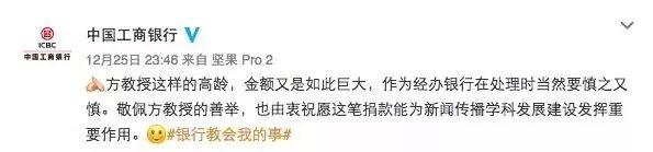 看著銀行工作人員一副“老先生肯定被騙了”的表情,陪同方教授去銀行的中國人民大學(xué)新聞學(xué)院教授王潤(rùn)澤哭笑不得,在手機(jī)里翻出前一天捐贈(zèng)儀式的新聞,還播放了現(xiàn)場(chǎng)的視頻,加上老先生再三確認(rèn),銀行工作人員才為他辦理了業(yè)務(wù)。