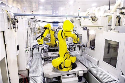 1月16日,機(jī)器人在瑞安市瑞明集團(tuán)智能化托盤線上搬運(yùn)物料。該生產(chǎn)線上,1個(gè)工人可操縱4臺(tái)機(jī)器人,輕松完成相當(dāng)于以前30個(gè)工人的工作。 新華社記者 翁忻旸 攝