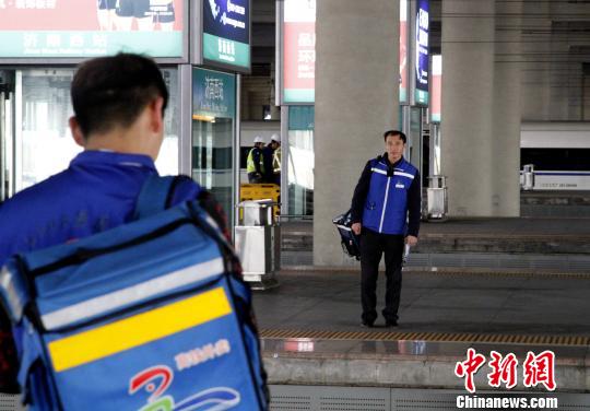 12306網(wǎng)絡(luò)訂餐濟(jì)南西站配送中心的“外賣(mài)小哥”經(jīng)常被派至不同站臺(tái)。圖為“外賣(mài)小哥”隔著站臺(tái)相望!∩骋(jiàn)龍 攝